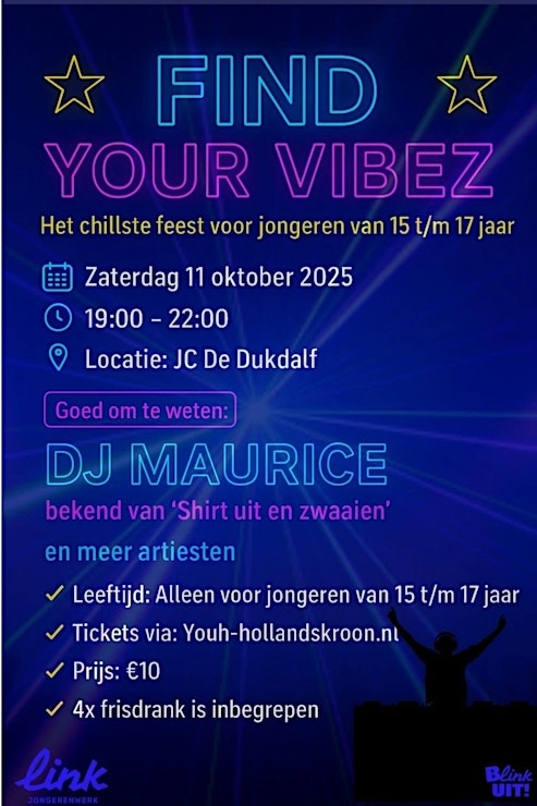 Op Find your Vibez wordt geen alcohol geschonken. Het is een frisfeest voor jongeren van 15 t/m 17 jaar oud. Hier kun je veilig leren omgaan met feesten en festiviteiten onder toeziend oog van de lokale jongerenwerker.
